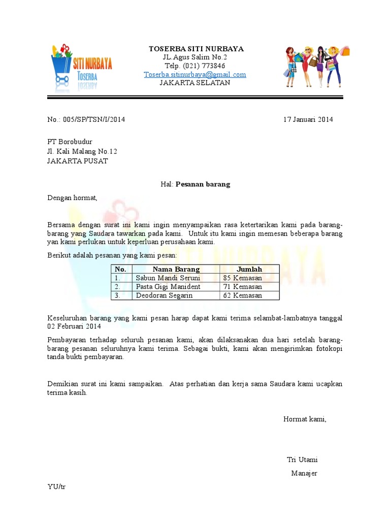 10 Contoh Surat Pesanan Barang Elektronik Kantor Atk Dan Rumah from noreenfraserfoundation.org Maybe you would like to learn more about one of these? Contoh surat order pembelian barang. Check spelling or type a new query. We did not find results for: